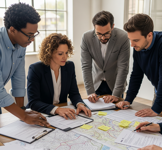 Alt Description: Individuals meticulously examining property documents and detailed maps, symbolizing the process of understanding and verifying land ownership.