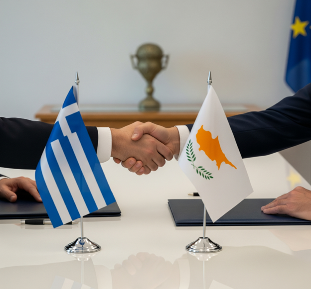 Alt Description: A handshake over a table adorned with Greek and Cypriot flags, representing the international agreements that help expats avoid double taxation.