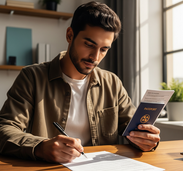 Alt Description: A person holding a Greek passport and a pen, diligently filling out official forms, representing the administrative process of changing tax residence.